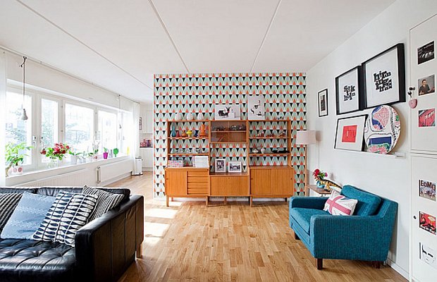 Revestimento da poltrona de couro, papel de parede com estampa dos anos 70, almofada felpuda e madeira no chão. Isso sim é que é estilo retrô moderno!