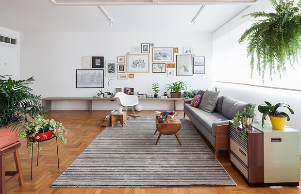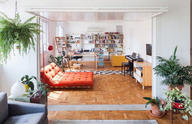Apartamento-estúdio em São Paulo: espaço aberto, materiais simples, mistura eclética de móveis, plantas penduradas (tem planta mais anos 70 do que a samambaia?) e decor inspirada na década.