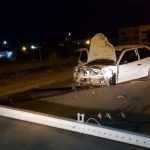 O carro bateu em um poste que partiu ao meio e caiu em cima do carro. Por causa da colisão, o transformador de energia quase caiu no automóvel.