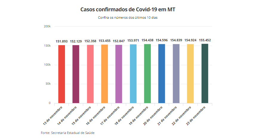 No dia 13 de novembro, o estado registrava 4.036 mortes em decorrência da doença. Já nesta segunda-feira (23), o número de mortes por Covid-19 em Mato Grosso chega a 4.097, ou seja, 61 óbitos em 10 dias.