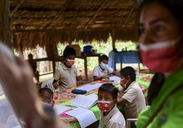 Uma professora viaja de canoa até uma comunidade indígena para ensinar crianças que não têm energia elétrica, nem recursos de tecnologia e internet para aulas online.