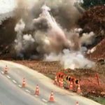 Para a detonação da rocha, a empresa responsável solicitou o bloqueio do fluxo de veículos porque o procedimento resulta em grande volume de poeira que pode prejudicar a visibilidade na via.