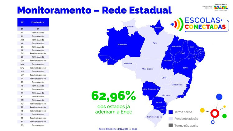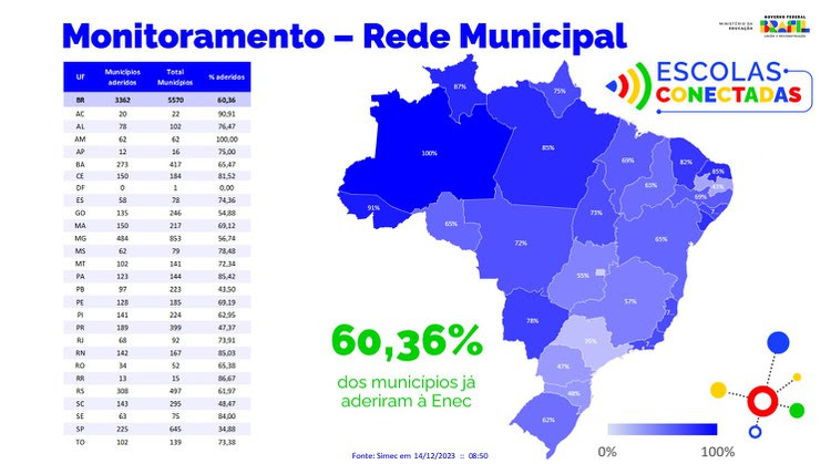 Monitoramento do Ministério da Educação (MEC) mostra que 3.362 municípios já aderiram (60.36%) à Estratégia, enquanto na rede estadual essa adesão foi de 17 estados (62,96%). No entanto, o esforço do Governo Federal é promover a inclusão digital e social de norte a sul do Brasil, em todos os estados e municípios.