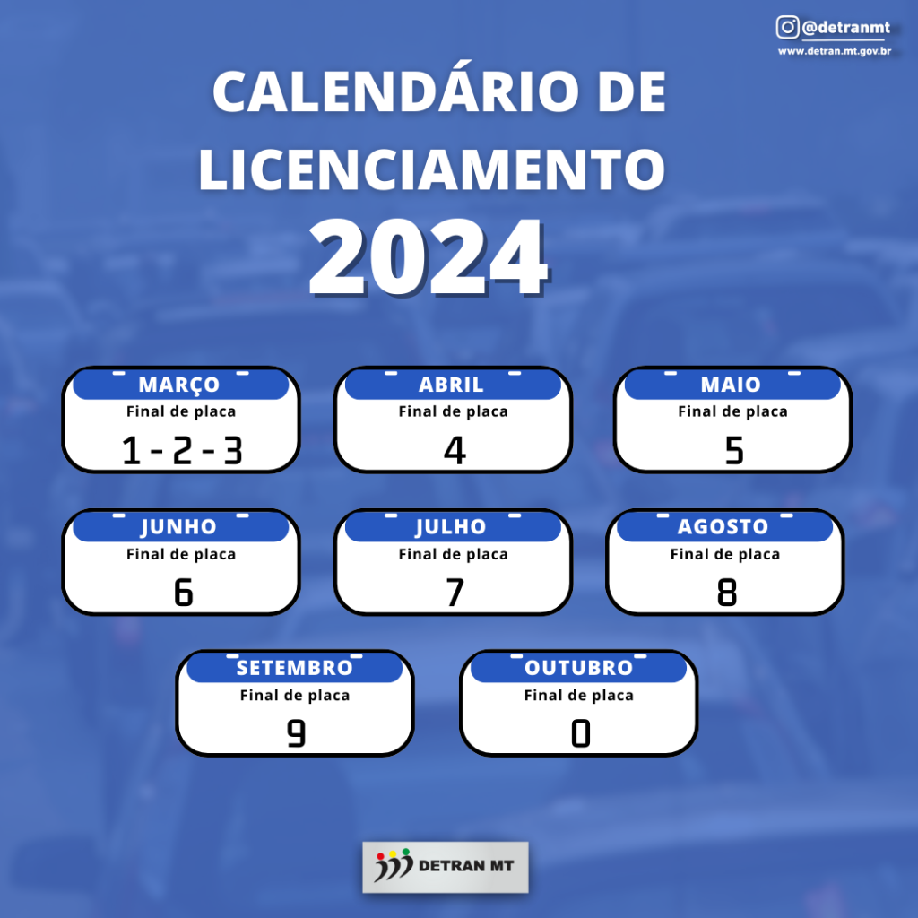 Proprietários de veículos com placa finais 1, 2 e 3 devem efetuar o pagamento do Licenciamento 2024 até o dia 31 de março. Para veículos com placa final 4, o pagamento será até o dia 30 de abril; placa final 5, até o dia 31 de maio; final 6 até o dia 30 de junho; final 7 até 31 de julho; final 8 até 31 de agosto; final 9 até 30 de setembro e placa final 0 até o dia 31 de outubro.