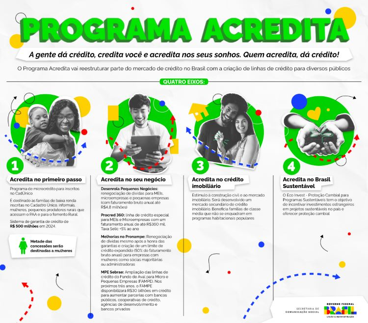 EIXOS – O Acredita está baseado em quatro eixos principais. O primeiro (Acredita no Primeiro Passo) é um programa de microcrédito para inscritos no CadÚnico. O segundo (Acredita no seu negócio) é voltado às empresas, por meio do Desenrola Pequenos Negócios e Procred 360. Há ainda uma frente que visa a criação do mercado secundário para crédito imobiliário. Por último, a aposta no Eco Invest Brasil – Proteção Cambial para Investimentos Verdes (PTE), que tem como objetivo incentivar investimentos estrangeiros em projetos sustentáveis no Brasil.