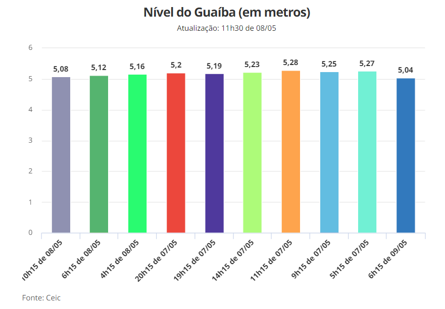 A medição feita no mesmo horário na quarta-feira (8) indicava 5,12 metros. Nesta quinta, 5,04 metros: uma diferença de 8 centímetros.