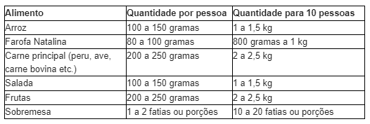 Confira a tabela abaixo com as quantidades certas para cada alimento: