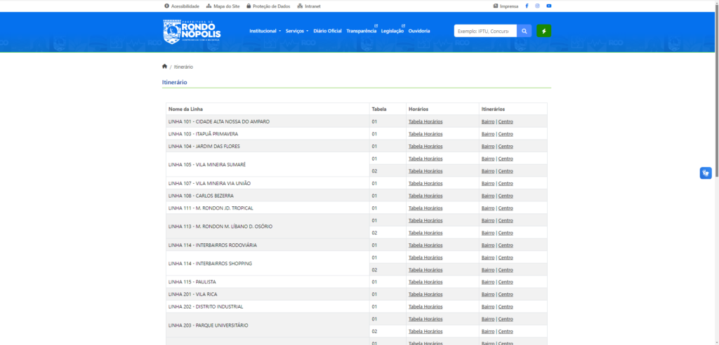 Para acessar, basta entrar no site da Prefeitura (www.rondonopolis.mt.gov.br), clicar no menu “Serviços”, selecionar a opção “Cidadão” e, em seguida, “AMTC Itinerário”. Também é possível acessar diretamente pelo link: www.rondonopolis.mt.gov.br/iti…